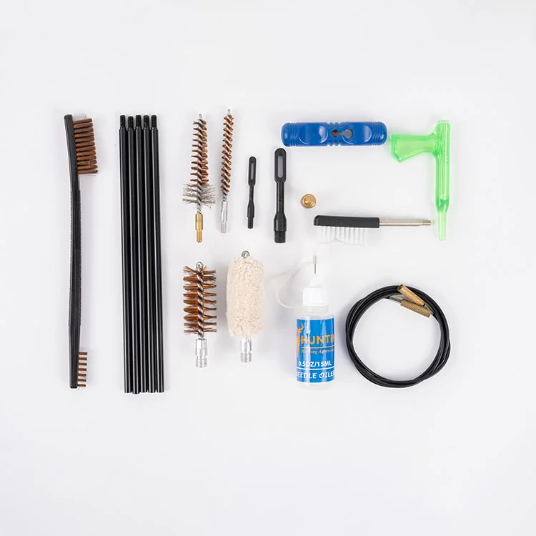 1 Stück individueller Griff, 3 Stück Bohrbürsten (12 GA, . 223Cal), 1 Stück Sternkammer-Bohrbürste (5, 56 mm), 1 Stück 3-in-1-Bohrungsbeleuchtung, 1 Stück Mopp (12 GA), 1 Stück Reinigungsbürste mit 8–32 Fäden, 1 Stück Reinigungsmessingbürste, 1 Stück Patch-Abzieher